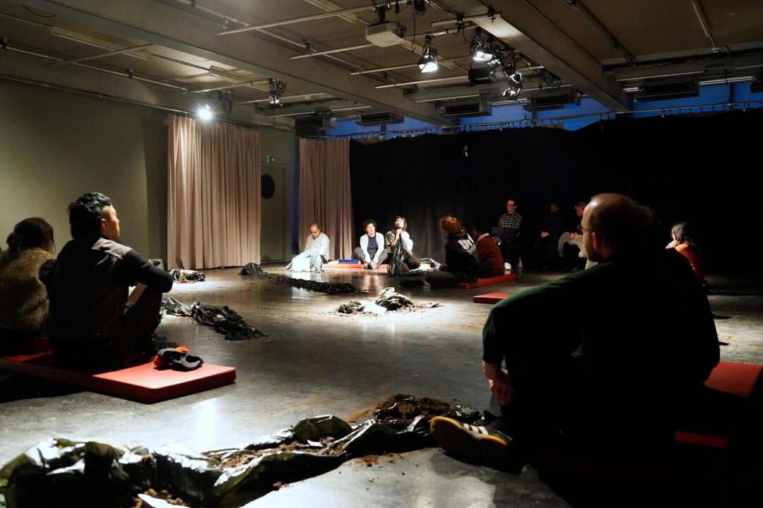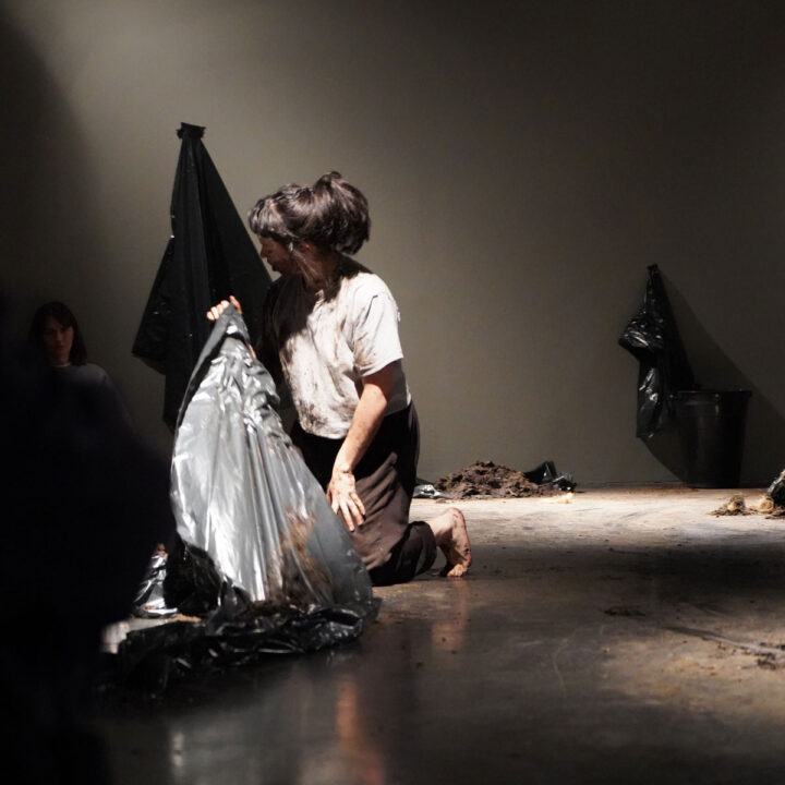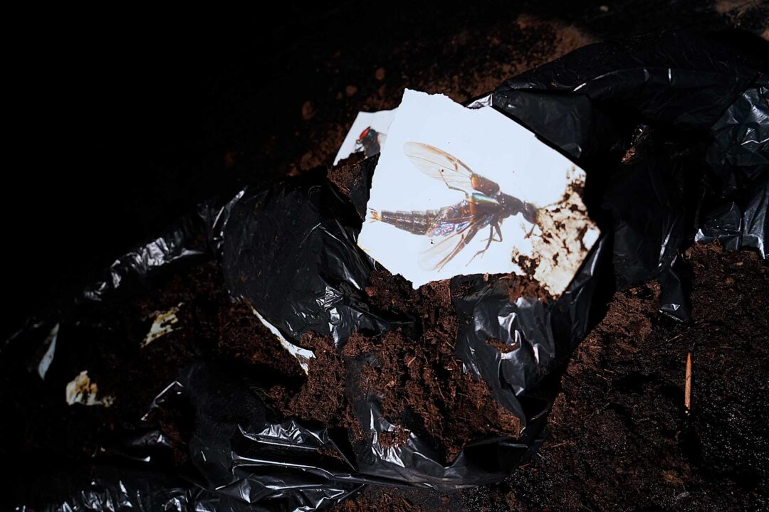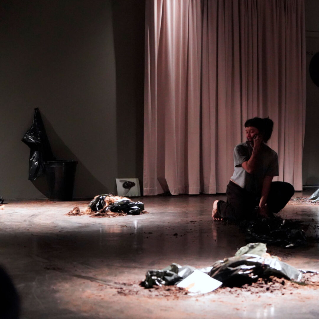 The space is dimly lit. Piles of earth are scattered across the floor. Viewers eventually sit on soft pads placed on the ground, bringing their bodies physically closer to the soil that delineates the space. Photographs of insects are placed around the stage, strands of hair appear among the materials, and large black plastic bags recall body bags. Meanwhile, sounds in the room evoke the movements of unseen creatures: insects burrowing into the earth or buzzing about in the air; perhaps, birds singing; the sound of water, thick and dense like mud. At one point, the artist tells the audience that the first fly typically arrives only nine minutes after a dead body begins to decompose, a sordid reminder of how quickly nature sets to work.