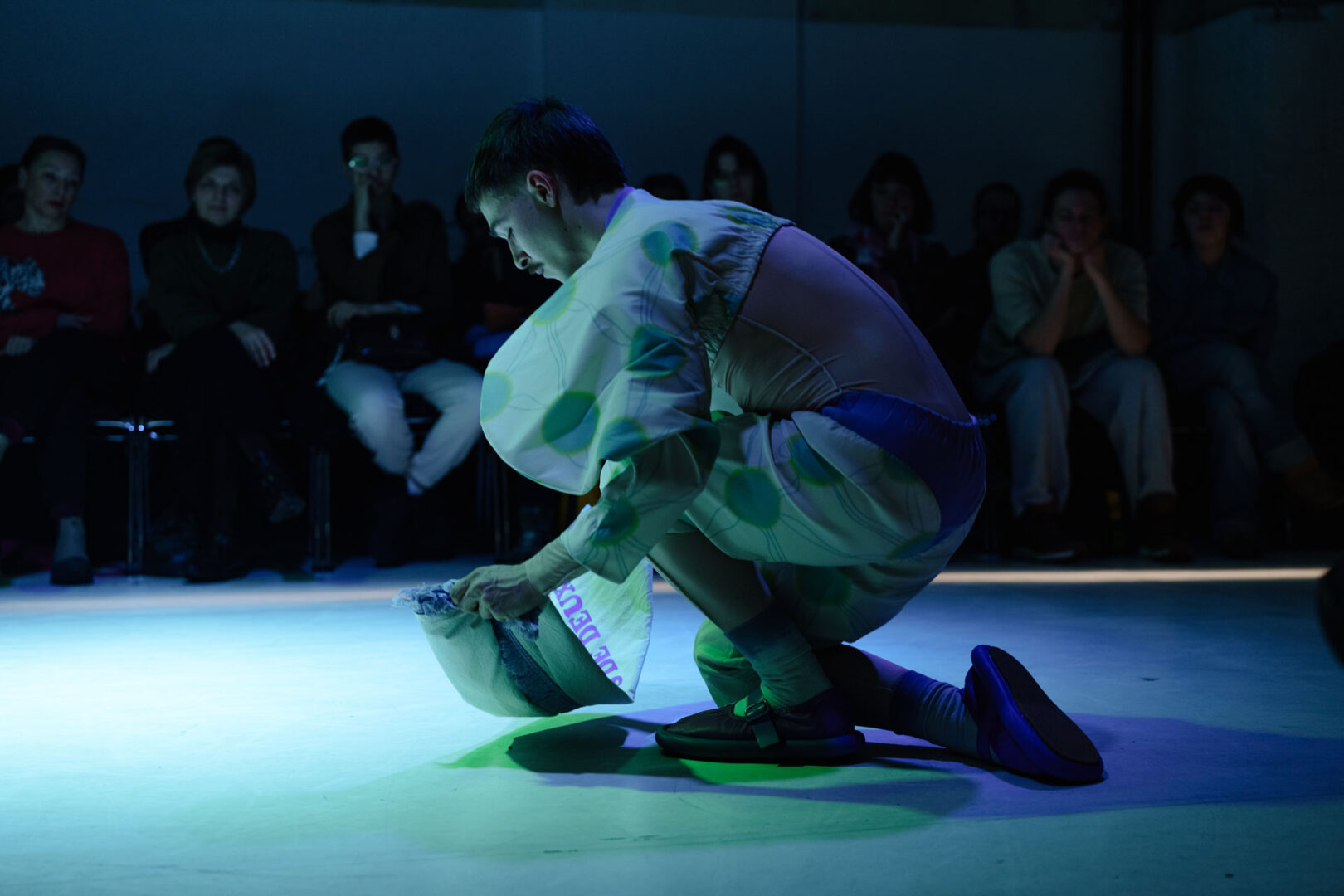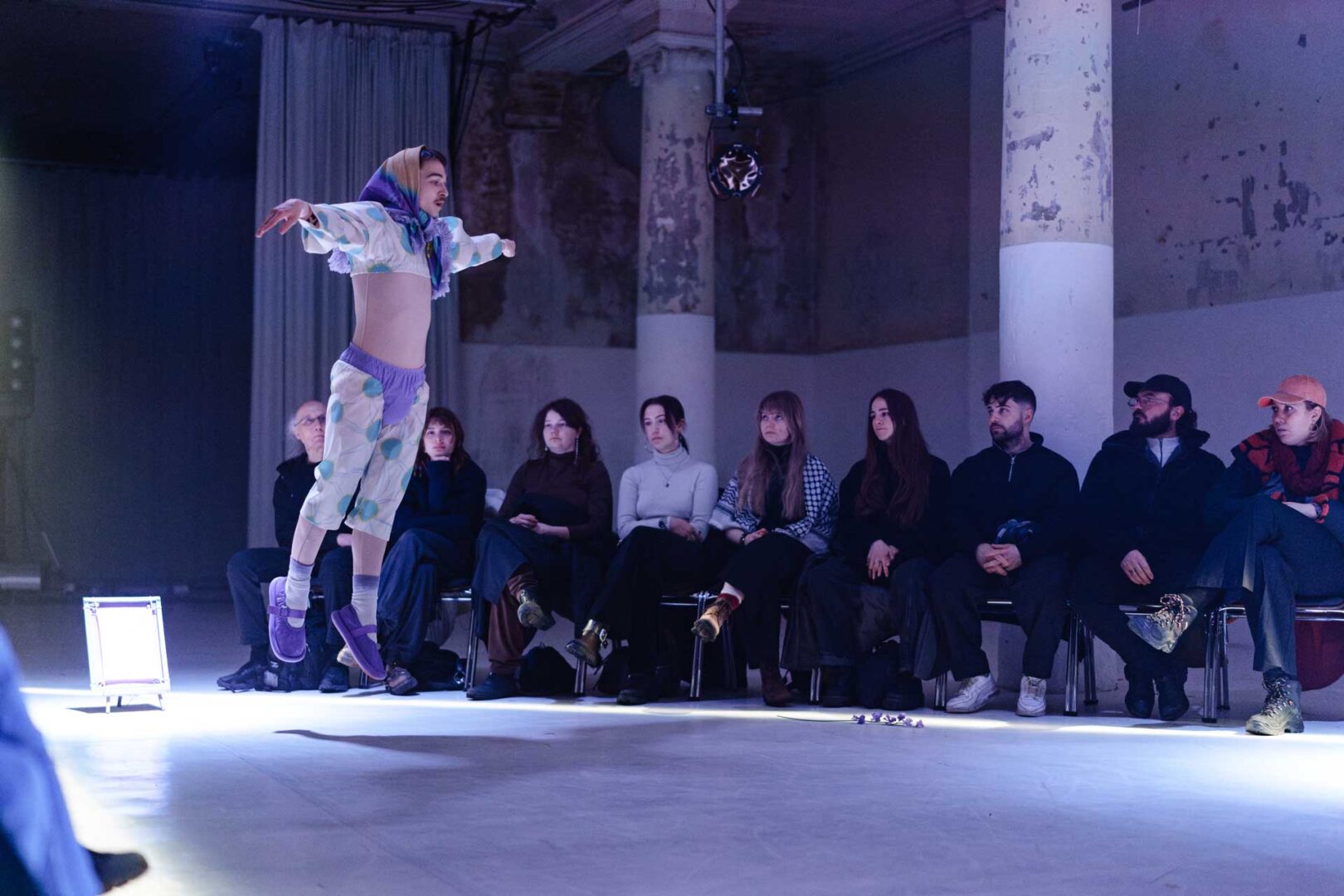 Rybicki dances with the spirits and for the spirits—at times solemn, at times ironic—striving for beauty while accepting imperfection. He jokes, pays tribute, stumbles, and begins again. The pastel-violet costume by Paweł Włodarski is particularly striking. On the one hand, it evokes folk costumes from Central and Eastern Europe, perhaps alluding to the Russian tradition of Chekhov’s homeland; on the other, it recalls the geometric puppet figures of Bauhaus aesthetics.